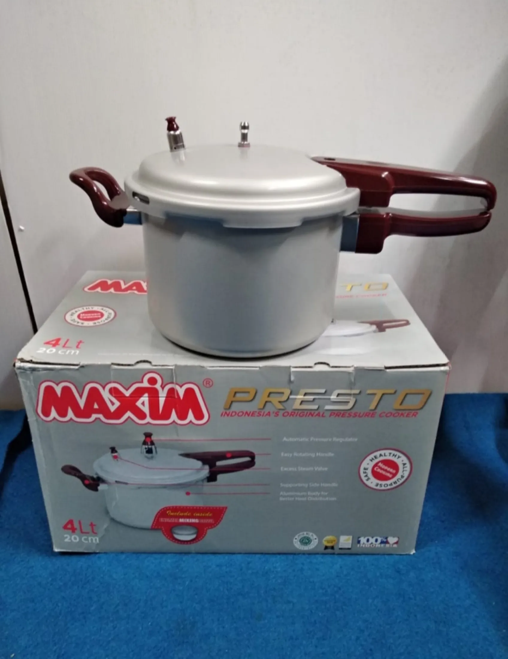 Menggunakan panci presto saat memasak akan membuat daging terasa lebih empuk. Saya membelinya di lulu hypermart ja. Mudah hanya dengan 30 menit saja langsung bisa. Alumunium merupakan bahan material utama panci maxim presto ini sehingga panas yang dihasilkan akan merata dan membuat makanan akan menjadi lebih cepat matang. Untuk nasi, isinya tidak melebihi 2/3 panci, dan untuk bahan yang mengembang seperti tepung, kacang, dll isinya tidak boleh melebihi 1/2 presto (sumber: