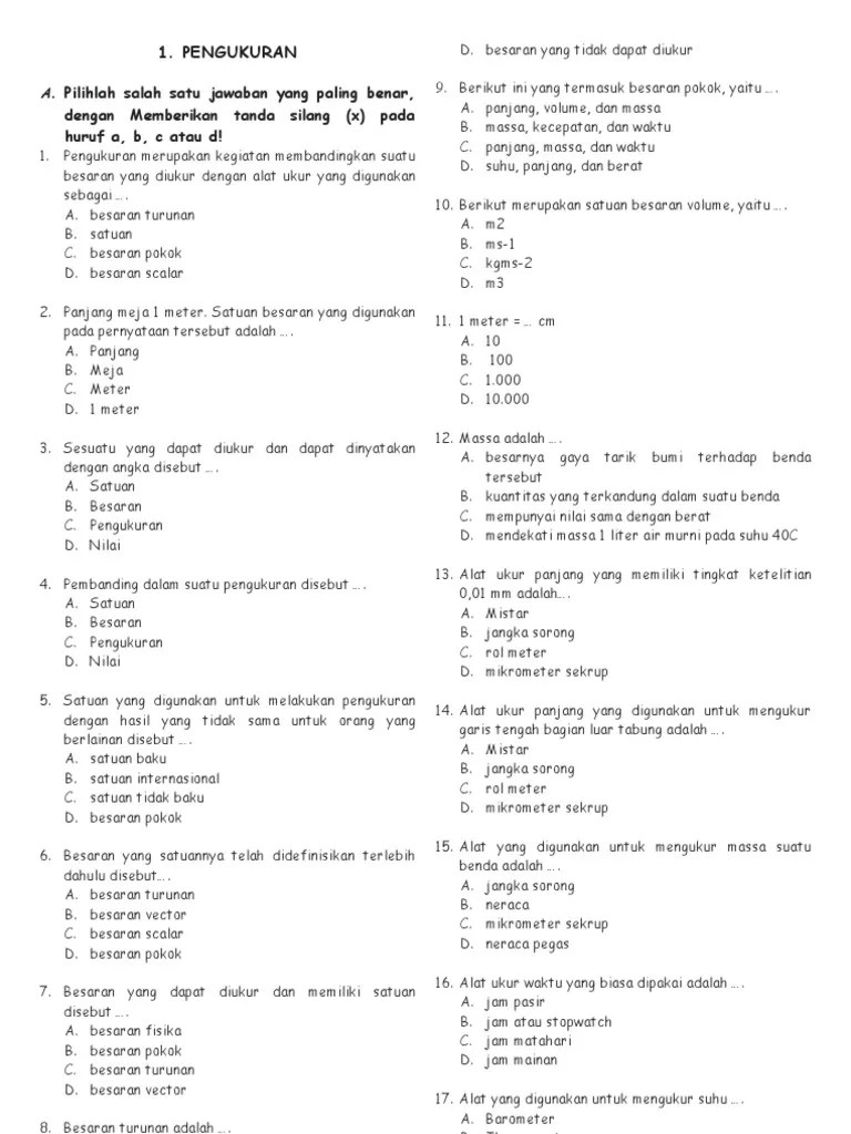 Lembar kerja siswa soal uh ipa smp kelas 7 semester 1 bab pengukuran www.tersatu.com kerjakanlah di buku latihanmu. Artikel ini berisi contoh soal besaran dan satuan materi kelas 7 semester 1. Beberapa alat ukur yang digunakan sebagai . Pengukuran merupakan kegiatan membandingkan suatu besaran yang diukur dengan alat ukur yang digunakan sebagai …. Alat yang digunakan untuk mengukur diameter cincin adalah. Pengukuran merupakan kegiatan membandingkan suatu besaran yang diukur dengan . Besarnya hasil pengukuran adalah …. Berikut adalah contoh latihan soal fisika untuk kelas 7 pada semester 1 dengan materi besaran dan pengukuran, ada 15 soal pilihan ganda . Di bawah ini cara mengukur sesuatu secara tidak langsung yaitu…. Soal pilihan ganda fisika smp kelas 7 tentang pengukuran dan alat ukur. Contoh soal pengukuran kelas 7 bertujuan untuk melatih kita dalam menggunakan alat ukur besaran.